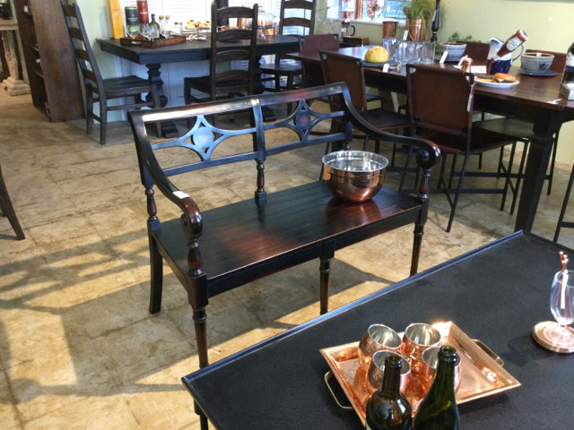 44"w brown burnished wood finish w/ scroll arms and open work back.