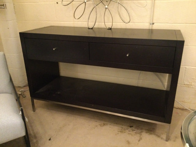20x54x34 dark wood w/ two drawers and open shelf below on silver metal stand. Some AS IS