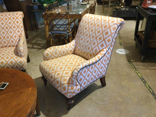 28"w cream and tangerine Ikat fabric w/ sloped arms and nailheads, some wear.