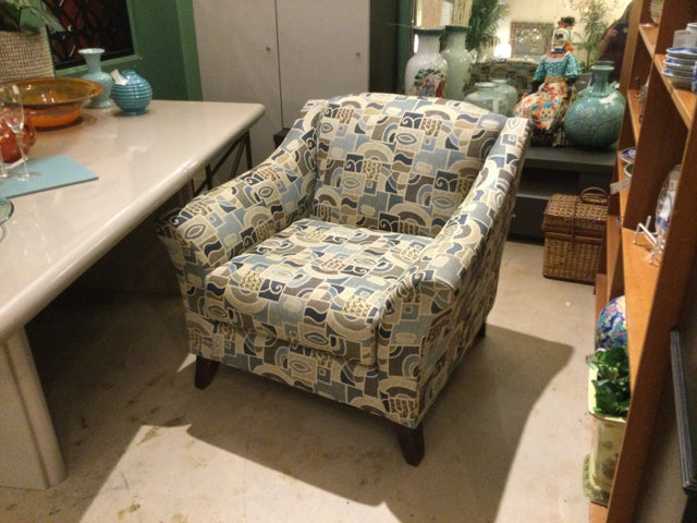 38"w beige, pale aqua and blue geometric w/ curved arms.