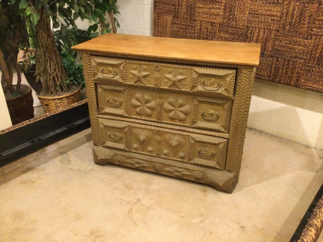 17x38x31 3-drawer light wood w/ raised star and heart design on front, some wear.