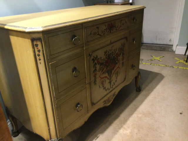 3x47x35 distressed gold w/ 3 drawers, hand painted floral front, curved legs and scalloped front, slight as is.