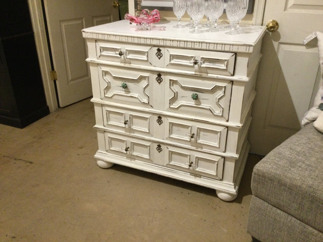 23x37x37 white distressed painted w/ 4 drawers, some wear. ***PROF.DEL.ONLY***